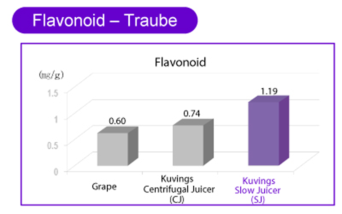 למיץ המופק ממחלץ מיץ איטי (Slow Juicer) יש תכולת פלבנואידים גבוהה במיוחד, הודות לכך שהוא סוחט גם את הקליפות וזרעי הענבים.